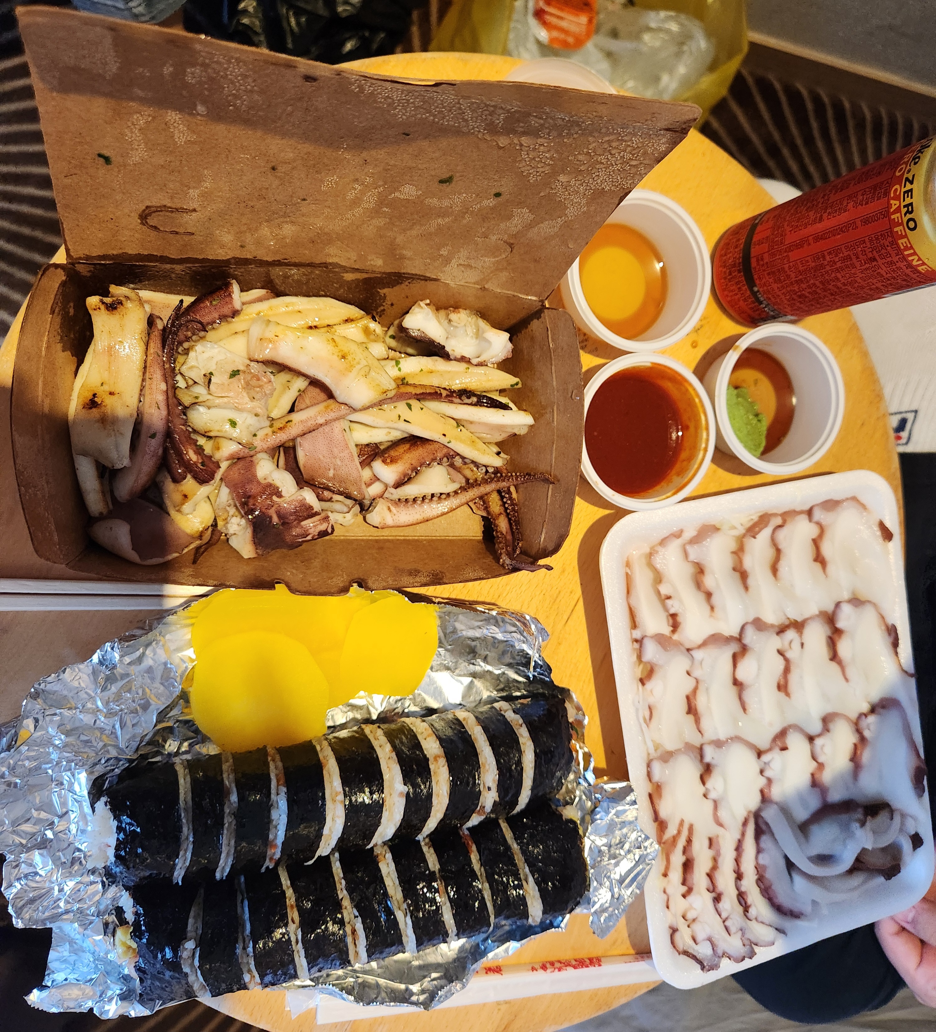 저희숙소는 골든데이지호텔이다 보니 그럴필요가 없었습니다 시장에서 야식을 사와서 김밥과 같이 먹었습니다 문어숙회 10,000원 오징어몸통 큰놈 15,000원 오는정김밥 9,000원 입니다